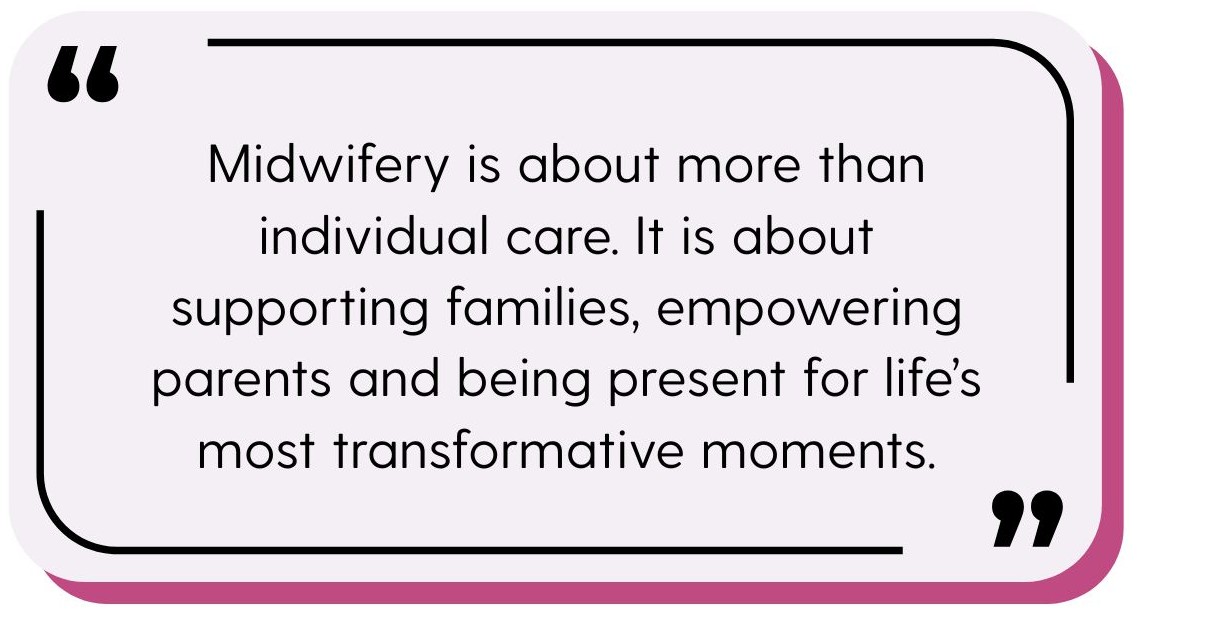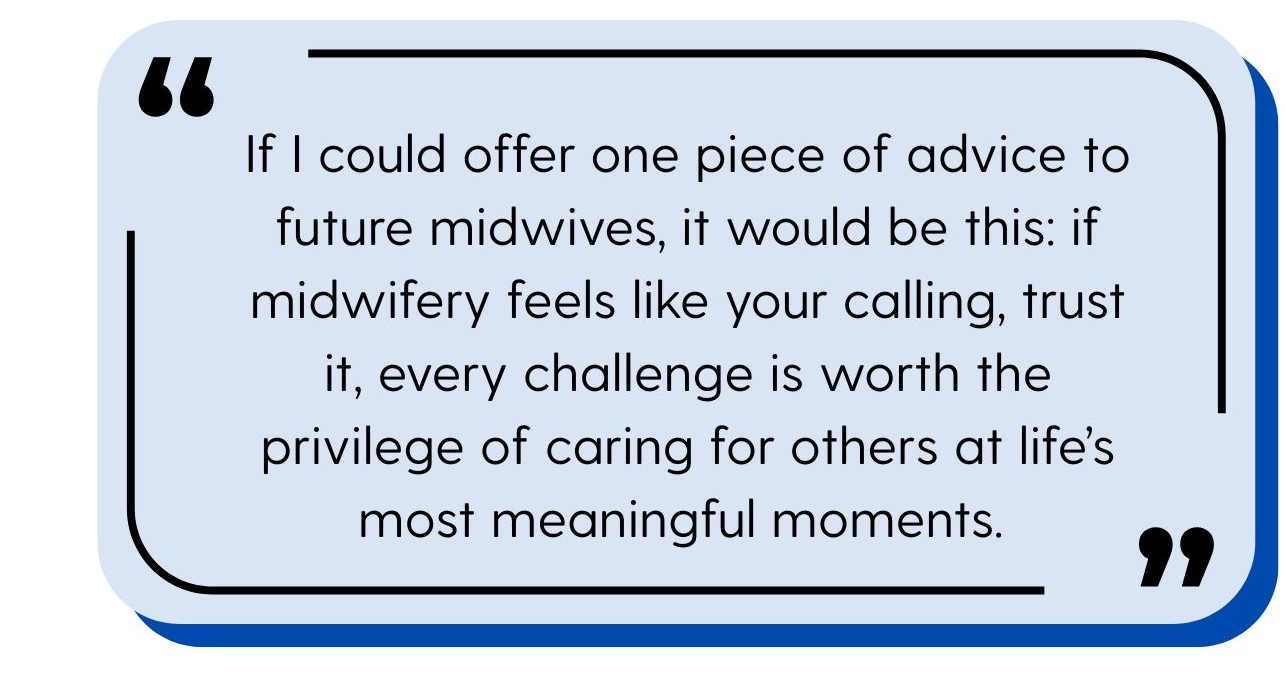 Midwifery is about more than individual care. It is about supporting families, empowering parents and being present for life’s most transformative moments. Knowing I can make a difference, even in small ways, motivates me every day to be the best midwife I can be. If I could offer one piece of advice to future midwives, it would be this: if midwifery feels like your calling, trust it, every challenge is worth the privilege of caring for others at life’s most meaningful moments.